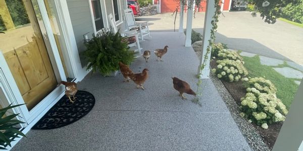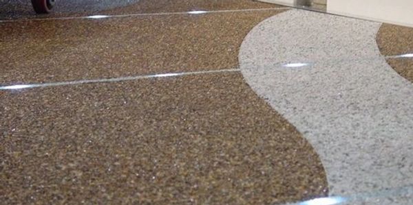 Blended or solid color aggregates are hand broadcast into clear epoxies in multiple layers, creating a system that dries to approximately 1/8” thickness.